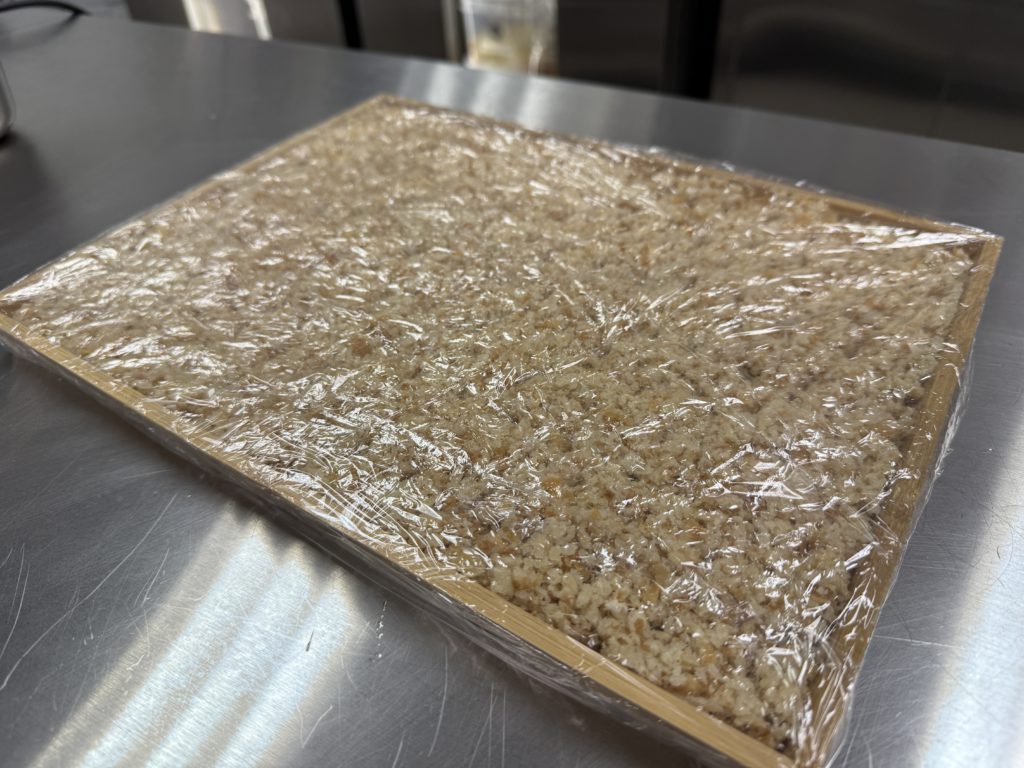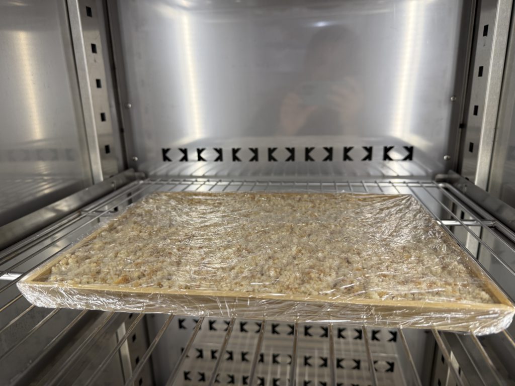 Spread your bread-koji mixture onto a wooden tray in an even layer, about 1-2 cm deep. Wood is ideal because it’s slightly breathable, but any shallow container will work.