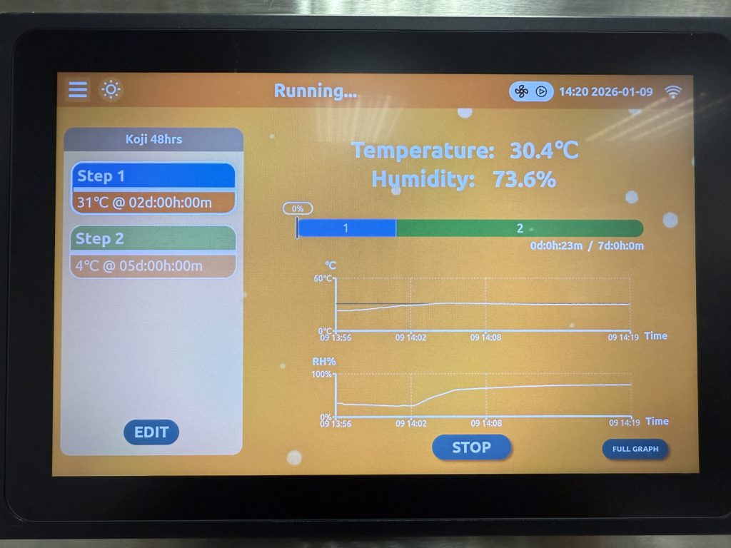 If your fermentation allows it can automatically adjust the temperature to 4°C (39°F) after 30 days. This halts the enzymatic fermentation, preserving exactly the flavour you’ve developed. (The 4°C step in your chamber program serves as a safety net—if life gets busy, your miso won’t over-ferment.)